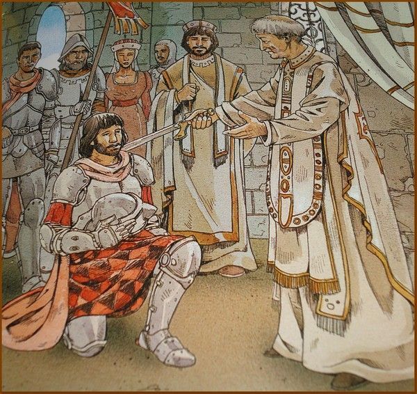 il est l'homme de guerre par excellence.Avant d'être admis par ses aînés,il devra suivre un long apprentissage.Il lui faudra aussi bien apprendre à connaître la nature et les bonnes manières qu'à manier les armes.Cette formation se clôt par l'adoubement.Dès lors, il doit être courtois,courageux et loyal,comme tout chevalier.Le jeune garçon quitte sa famille à 7 ans pour un autre château.Il est confié à un seigneur,sorte de parrain qui se charge de son éducation.Il devient page , puis écuyer de son maître.à 20 ans,le jeune noble passe la cérémonie de l'adoubement,c'est l'instant où le chevalier,un genou à terre devant son seigneur,reçoit un coup d'épé sur son épaule avec le plat de l'épé,celui-ci fait serment de mettre son arme au service de Dieu et des plus faible.Puis viennent les réjouissances.Le harnois représente l'ensemble de l'équipement indispensable au chevalier , il le reçoit donc à cette occasion.